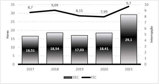 Conforme observado no Gráfico 2, a qualidade do fornecimento de energia elétrica no Maranhão demonstrou piora em seus indicadores de continuidade do sistema. Ou seja, o DEC passou de 18,41 horas de interrupção média em 2020 para 29,1 horas em 2021, o que representa uma elevação de 58,07%. Em termos da frequência da falta de energia mensurada pelo FEC, o ano de 2020 registrou uma média de 7,99 interrupções contra 9,7 em 2021, significando uma piora de 21,4% no intervalo do período analisado.