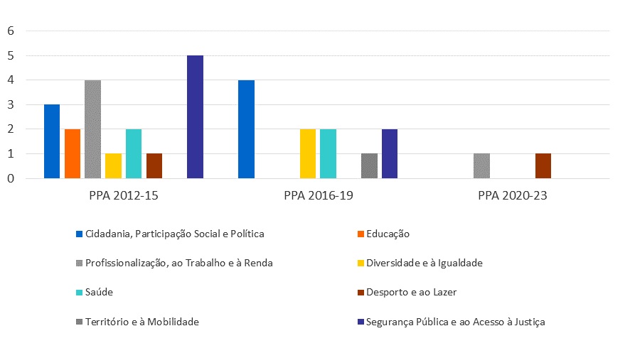 Quanto aos programas, como indicado no Quadro 1, acima, o PPA 2012-2015 apresenta o programa específico de juventudes, chamado Autonomia e Emancipação da Juventude, mais cinco programas de diferentes setores que contemplam objetivos para as juventudes. O PPA 2016-2019 apresenta a mesma configuração, nomeando o programa específico de Promoção dos Direitos da Juventude. Já o PPA 2020-2023 não dedica um programa específico às juventudes e reduz para somente dois programas os que se dedicam a contemplar as juventudes em seus resultados intermediários.