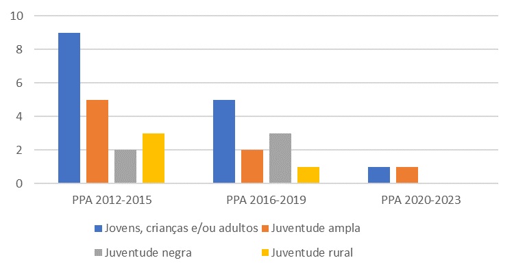 Nos documentos analisados, raras vezes os objetivos indicam grupos específicos da juventude. No Gráfico 2, é possível ver quantos objetivos mapeados nos PPAs citam os diferentes públicos. Analisando os três documentos, cabe destaque ao espaço dado às juventudes rurais, considerando que um a cada seis jovens no Brasil vive em área rural (ATLAS..., 2021) e que há uma escassez de políticas para os jovens do campo. Da mesma forma, é importante destacar as ações voltadas à juventude negra, especialmente considerando que essa parcela da população é a mais atingida pela violência e pelas desigualdades (ATLAS..., 2021).