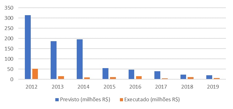Os Programas Orçamentários específicos para o tema da Juventude apresentaram baixa execução financeira, conforme mostra o gráfico 3. Os anos de 2012 a 2014 são aqueles com maior previsão orçamentária, R$ 314 milhões, R$ 186 milhões e R$ 196 milhões, respectivamente. Já 2019 é o ano com menor previsão orçamentária, R$ 19 milhões. O ano de 2012 destaca-se como o ano de maior investimento efetivado, R$ 51 milhões, sendo mais de R$ 44 milhões investidos pelo Ministério do Trabalho e Emprego em ações de qualificação profissional para jovens, no programa Projovem. Já os anos de 2017 e 2019 são aqueles com o menor investimento da série histórica, R$ 4 milhões e R$ 6 milhões, respectivamente, dedicados a ações de institucionalização da política de juventude pela SNJ. O menor investimento nos últimos anos da série histórica retrata a menor densidade do Programa Promoção dos Direitos da Juventude, que fica com menos objetivos.