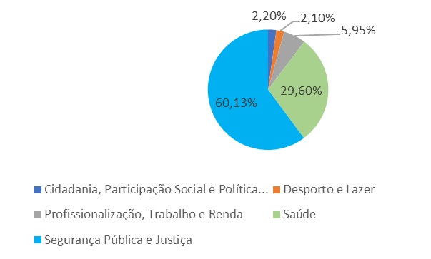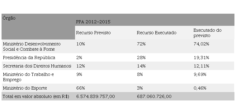 Conforme abordado na dimensão da transversalidade, há diferentes órgãos envolvidos na execução da política de juventude. A divisão dos recursos por órgãos responsáveis em cumprir os objetivos da política de juventude está detalhada nas tabelas 2 e 3, abaixo. Para o período de 2012-2015, a maior parte do valor executado foi pelo Ministério de Desenvolvimento Social e Combate à Fome, o qual também apresenta maior eficácia na execução financeira. Sua participação está relacionada a ações de combate ao trabalho de crianças e adolescentes em condições ilegais. Chama a atenção o volume alto de recurso encaminhado ao Ministério do Esporte e sua baixa execução - apenas 0,46% do previsto. Esses recursos previam, entre outras ações, as Praças da Juventude, equipamentos de convivência comunitária com estrutura esportiva. É provável que a previsão orçamentária para a pasta tenha sido influenciada pela realização da Copa do Mundo Fifa 2014. A Presidência da República, onde se encontrava a SNJ, ficou responsável principalmente por ações de articulação e institucionalização da política de juventude, e a Secretaria de Direitos Humanos, por ações no combate à violação de direitos.