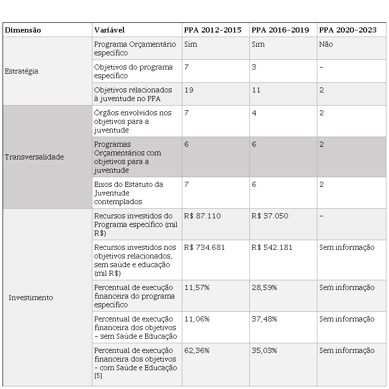 Na dimensão que se dedica a pensar o espaço estratégico, é possível perceber que o PPA 2020-2023 é o único que não dedica um Programa Orçamentário específico ao tema da juventude. Com relação a objetivos mapeados que mencionem a juventude como alvo da política, considerando todos os programas finalísticos, percebe-se que os Planos anteriores estabelecem um maior número de objetivos - seguindo a ordem cronológica, indicam-se respectivamente 26, 11 e 2. Esse dado demonstra perda do espaço estratégico do PPA de 2012 para o de 2016 e perda acentuada no de 2020.