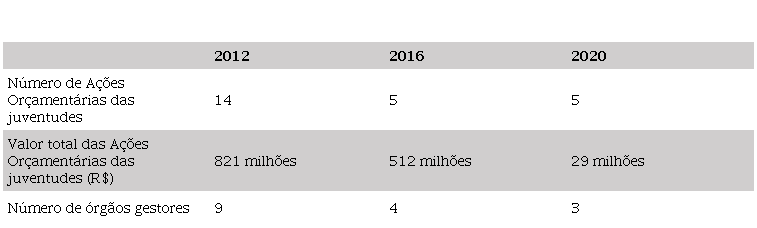 A queda no investimento do PPA 2012-2015 para o PPA 2016-2019 é verificada tanto no valor investido no programa específico da juventude (com queda de quase 60%), quanto no conjunto dos objetivos relacionados à juventude (com queda de quase 30%). Já o PPA 2020, em função de não ligar diretamente seu planejamento estratégico (PPA) à execução de ações orçamentárias, dificulta tal análise a partir dos objetivos. No entanto, a tendência de enfraquecimento da política de juventude é observada quando são analisadas as ações orçamentárias indicadas na LOA. Foram selecionadas as ações que tivessem as palavras-chave jovem, juventude e suas formas plurais, de anos representativos de cada período, conforme é mostrado da tabela 1, abaixo. Os dados indicam que o número de ações orçamentárias cai de 2012 para 2016 e se mantém em 2020, porém com valor previsto para investimento menor em mais de 90% em relação ao período anterior. Além disso, o número de órgãos envolvidos com o orçamento para as juventudes também sofre queda no período.