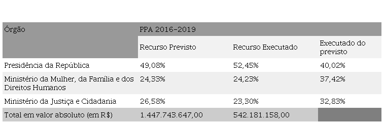 Para o período de 2016-2019, a maior parte do recurso previsto foi direcionada à Presidência da República, que foi responsável por executar mais da metade do valor total investido e apresentou a maior eficiência, investindo 40,02% do recurso previsto.