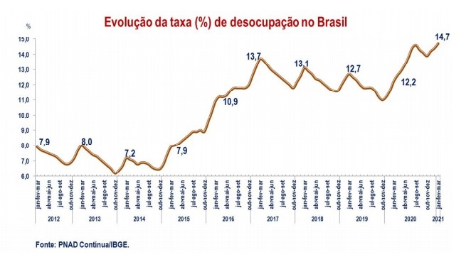 Dados apresentados pelo Instituto Brasileiro de Geografia e Estatística (IBGE, 2021) bem demonstram a afirmação acima. A taxa de desocupação é assustadora no país, como evidenciado no gráfico a seguir.