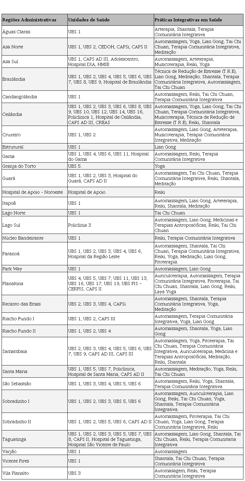 No site da Secretaria de Estado de Saúde do Distrito Federal, localiza-se um espaço específico para a publicização de informações sobre as PIS, com diversos informativos, guias, folders, manuais, o documento da própria Política Distrital de Práticas Integrativas em Saúde e um conjunto de documentos com a relação da oferta de PIS no SUS-DF, organizados por Regiões Administrativas e com última atualização feita em 05 de julho de 2019, à época da coleta de dados. O que significa que a principal fonte de informação de fácil acesso da oferta das PIS no DF estava desatualizada. O Quadro 1 elenca a oferta das PIS nos serviços de saúde por regiões administrativas no SUS-DF. Observa-se a ausência de Práticas Integrativas afro-brasileiras, lacuna posta desde a formulação da Política.