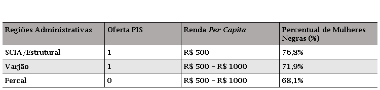 O Distrito Federal, oitavo maior PIB do Brasil, dispõe de um maior percentual de mulheres negras localizadas no SCIA/Estrutural (76,8%), Fercal (71,9%), Varjão e São Sebastião (ambos com 68,1%) e Itapoã (67,2%). São Regiões Administrativas conhecidas por índices menores de renda e de condições precárias de habitação (CODEPLAN, 2014). De acordo com o Atlas do Distrito Federal, em 2018, a renda per capita no SCIA/Estrutural foi quinhentos reais, a menor do Distrito Federal. Enquanto nas RAs Fercal, Varjão e Itapoã, a renda per capita esteve entre quinhentos e mil reais, e em São Sebastião, entre mil e dois mil reais. Em contrapartida, o Lago Sul representou a maior renda per capita do DF, entre sete mil e oito mil reais (CODEPLAN, 2020).
