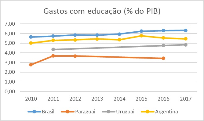 O investimento social do Paraguai é inferior aos demais países do Mercosul, os dados de 2015 a 2018 revelam o gasto social do governo sempre inferior a 9% do PIB, com um aumento de 2015 (8,02%) para 2018 (8,94%). Ainda que se vislumbre um aumento no gasto social em relação ao PIB, o cenário é diferente quando se analisa o panorama da educação (Gráfico 2), ademais de se notar uma redução de 2012 para 2016, o valor investido é muito inferior aos demais países do bloco.