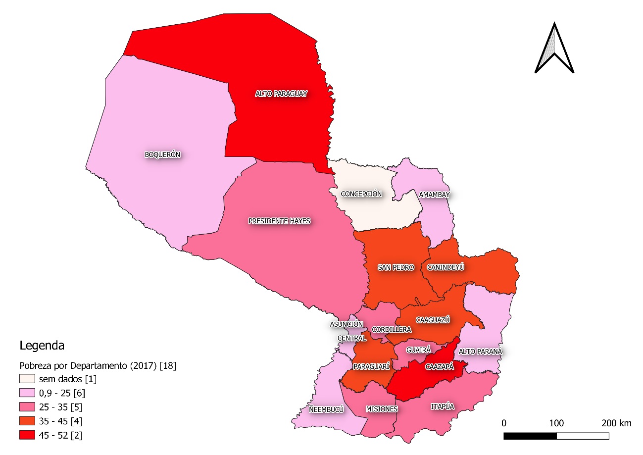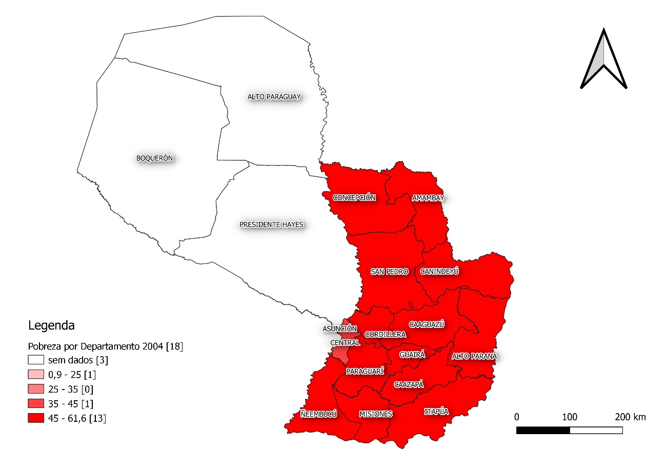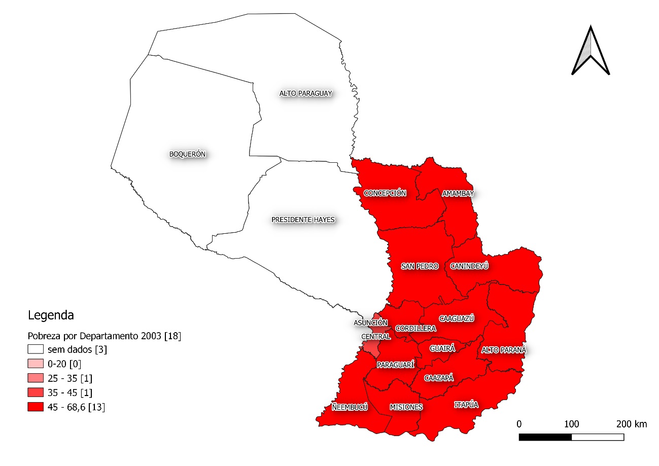 É possível notar nos mapas em questão, que a situação de pobreza é crítica naquele período, mais de 13 departamentos estão no mais alto grau de indicador de pobreza, as regiões que estão em situação menos grave são apenas: Asunción e Central. Evidenciando mais um fator do cenário de pobreza, ela é agravada nas áreas rurais, isso porque nestas regiões o valor salarial e a quantidade de empregos gerados são menores. Outrossim, salienta-se o perfil produtivo do país, essencialmente agrícola, portanto o modelo produtivo adotado pelo país favorece a concentração de renda e consequente aumento de desigualdades2.