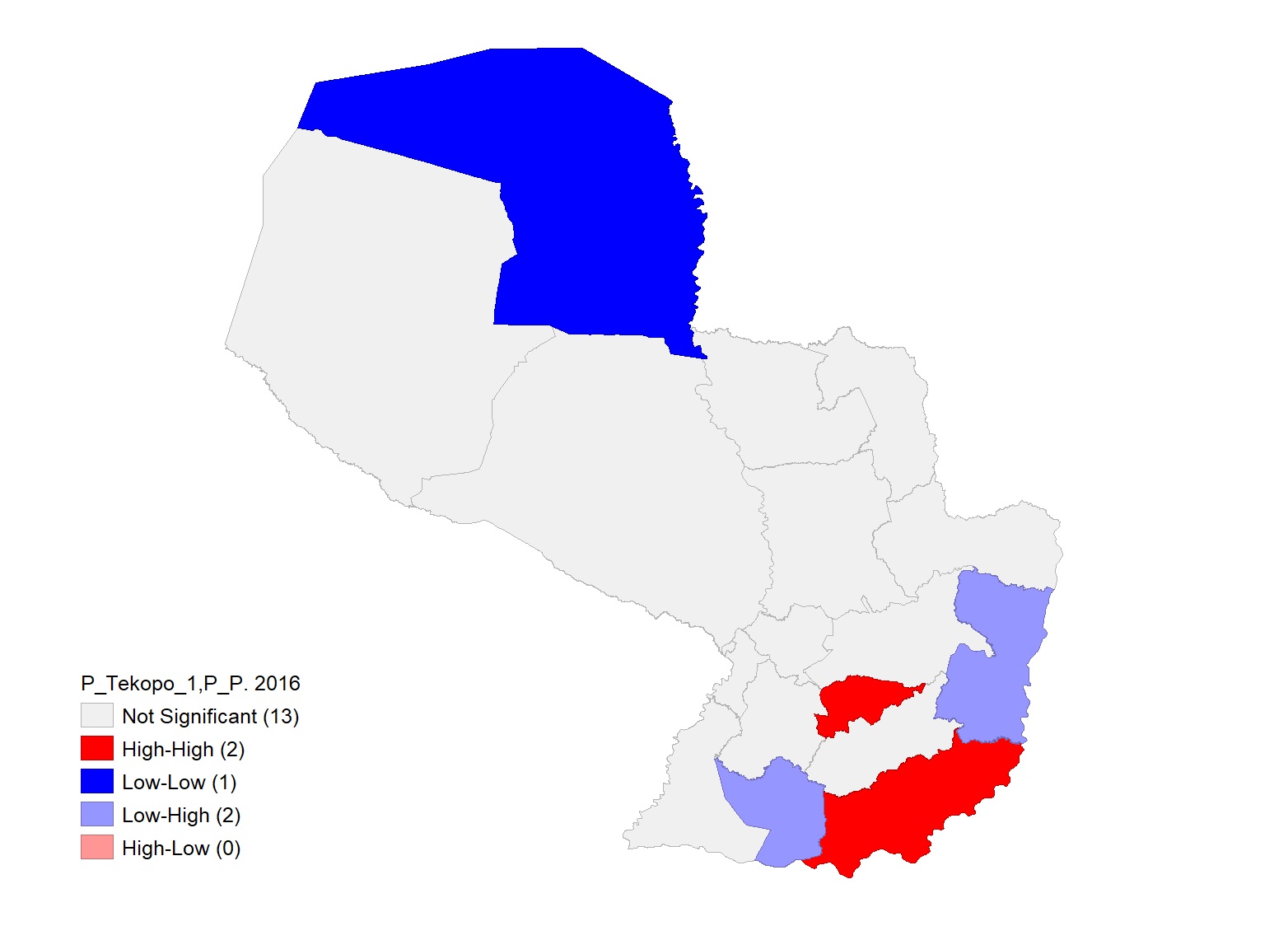 Após avaliar os dados isoladamente, optou-se por realizar uma análise exploratória espacial (AEDE), com o intuito de identificar se haveria correlação espacial entre o programa Tekoporã e o indicador de pobreza por departamento. Em função da lacuna nos dados, foram considerados os dados de famílias atendidas em 2015 pelo programa e os indicadores de pobreza de 2016.