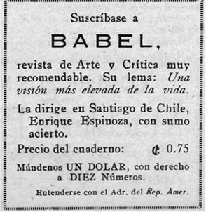 A partir de las reseñas a Babel que la misma revista inserta en el Nº 9, en las que se alude también a otras revistas latinoamericanas con las que podría compararse, se advierte que el formato obedece a lo que se puede identificar como un género entre las revistas del período, como la cubana Ultra. Cultura Contemporánea. Revista de Revistas, editada por Fernando Ortizentre 1936 y 1947 o como Repertorio Americano, la revista costarricense que, como decíamos, dirigió Joaquín García Monge entre 1919 y 1958. La reseña que el diario El Mercurio realiza de Babel, de hecho, subraya la afinidad entre Enrique Espinoza y García Monge como benefactores de las letras americanas. Espinoza mantenía un estrecho contacto con el editor costarricense, ya que en la década del treinta fueron frecuentes los artículos y textos en Repertorio Americano con su firma, los que conviven con otros sacados de diversas revistas hispanoamericanas o españolas.5