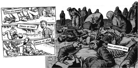 Cabe destacar ciertos usos transgresores en el lenguaje gráfico: primero, en términos temporales, los acontecimientos del pasado deberían haber sido ubicados en la parte izquierda de la página y los más contemporáneos en la derecha. Sacco no sigue el orden cronológico que les correspondería a los hechos en la paginación: del pasado al presente. La inversión otorga una mayor importancia y presencia visual a los hechos pasados, pues están más presentes que el presente. Segundo, de acuerdo con el tamaño de las viñetas se privilegia la matanza de Rafah, añadiendo la ausencia de bordes en la gráfica. Según Will Eisner, pionero en la novela gráfica, la viñeta sin borde lleva a la sensación de atemporalidad, lo que destaca la presencia continua de la matanza5. Se articula un presente continuo, abierto, que desplaza temporalmente las viñetas más alargadas y pequeñas del presente, mediante el montaje, ya que las viñetas tipo tiras del presente se sobreponen sobre el fondo de la matanza de Rafah. Ópticamente la técnica del montaje obliga a un ir y venir de la mirada en un juego de tema/fondo. El tema es la violencia contemporánea que tiene como telón la violencia del pasado. O el tema es la violencia del pasado que tiene como fondo la violencia contemporánea. El montaje abre ambas viñetas a una dialéctica de espejos en la que la violencia y los cuerpos heridos atraviesan ambos espacios temporales. En relación al montaje, Didi-Huberman señala: