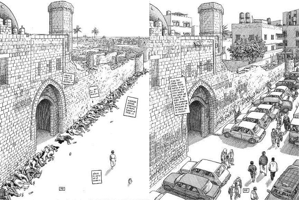 Pasan varias páginas para que Sacco permita la intrusión de un tiempo en otro. Al llegar a los relatos de la matanza de Khan Younis afloran, lentamente, las intrusiones. Misha Ashour, sobreviviente de la matanza, relata a Sacco cómo los hombres fueron puestos en fila y asesinados a tiros. El relato no es solo verbal, pues el testigo lleva a Sacco al lugar mismo de los hechos y representa lo ocurrido. En grandes viñetas vemos a Sacco y a Ashour en medio de la calle de hoy acompañado del relato del pasado. Hay, de parte del testigo, un claro intento, mediante el recurso de ir al espacio de la matanza, de escenificar y traer al presente ese pasado. A continuación, Sacco se sumerge en la matanza de la mano de un nuevo testigo: “Faris Barbakh que tenía entonces 14 años” (96). Al comienzo vemos al testigo en su edad actual, luego Sacco salta abruptamente al pasado y ahora es ese muchacho de 14 años quien nos lleva a la ciudad rodeada de soldados israelíes. Y en dos páginas enteras, en un nuevo montaje, puestas una al lado de la otra, Sacco choca el presente y el pasado.