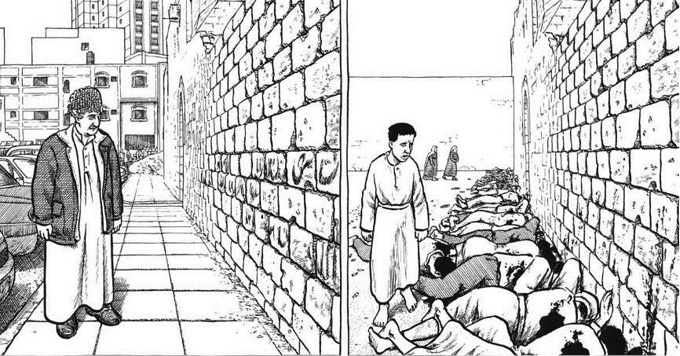 En la página izquierda, a hoja completa, vemos en una visión panorámica desde lo alto un regadero de cadáveres a lo largo del muro y al muchacho caminando. A la derecha y en contraste, vemos también en una página entera y desde lo alto, a Sacco y al hombre anciano que caminan a lo largo del mismo muro décadas después, donde se encontraban los cadáveres ahora hay autos. Ambos tiempos están separados, porque son viñetas distintas –y no hay una mezcla total de los tiempos–, pero sí hay un choque evidente. Un choque visual producto de la enormidad de las páginas, de la similitud exacta de la muralla, de la torre y del punto de vista. La limpieza de las viñetas, salpicadas solo por un par de cartuchos con el mínimo de texto, establece la anacronía como choque. Según Didi-Huberman: “el choque de tiempos en la imagen libera todas las modalidades del tiempo mismo, desde la experiencia reminiscente (Erinnerung) hasta los fuegos artificiales del deseo (Wunsch), desde el salto del origen (Ursprung) hasta la decadencia de las cosas (Untergang)” (171). Esto ocurre en estas dos imponentes viñetas. Sobre todo hay reminiscencia en el recuerdo del viejo y en el simultáneo andar del muchacho, es el viejo/muchacho que recorre el muro. Hay un testigo mudo que habla desde una permanencia. Nos referimos al muro, la presencia inmutable del muro, de ese objeto cargado de historia, de deseo y de reminiscencia. El muro que aparece en las dos páginas es el síntoma, entendido como “extraña conjunción de la diferencia y de la repetición” (66). Es el mismo muro, ciertamente, el muro en el que fueron asesinados decenas de jóvenes palestinos, acribillados por ametralladoras israelíes, pero es un muro diferente, frente al cual ahora se estacionan automóviles. El síntoma es “la apertura repentina y la aparición (aceleración) de una latencia o de una supervivencia” (66). Evidentemente que lo que hay en estas viñetas enormes puestas una al lado de la otra es la supervivencia: en ese muro sobrevive la matanza de Khan Younis de 1956. Ese hecho no ha pasado del todo, persiste a pesar del aparente caminar indiferente de nuevos palestinos. Persiste quizás debido a ese aparente caminar indiferente. El choque pone de manifiesto la matanza, esos hombres puestos en fila y sangrando a lo largo del muro. Es difícil saber qué imagen es más impactante, si la del pasado con los hombres amontonados o, por el contrario, la del presente sin los hombres, pero con la carga de esos muertos. De cualquier modo, la técnica de Sacco gatilla el efecto dramático: la supervivencia.