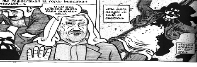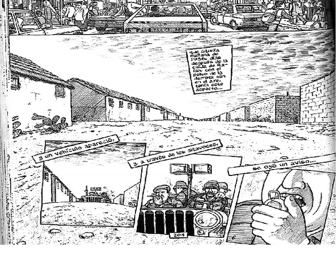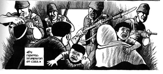 Si no fuera por los rostros de los testigos insertos en pequeños recuadros la transferencia sería total, quedaríamos del todo sumergidos en medio de los golpes del soldado. Para terminar con esta anacronía –consistente en el progresivo traslado del presente del testimonio al pasado del relato–, es necesario consignar el momento más logrado en Notas: la viñeta muda a doble página en la que los parientes recogen a sus muertos durante la noche.