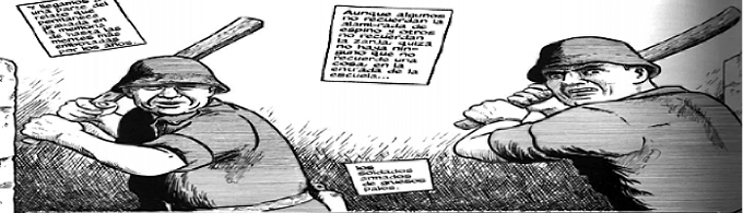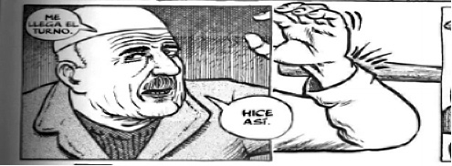 La misma técnica pero ahora centrada en la figura del testigo frente al muro: hoy y ayer. Dos viñetas: el mismo muro, la misma persona, la misma postura corporal. Repetición y diferencia. La diferencia, como un macabro juego de “buscar la diferencia” es la ausencia de los cadáveres en la viñeta de la actualidad. Sin embargo, los cadáveres están bajo la categoría de la supervivencia. El viejo los sigue mirando, los recrea en su memoria ahí junto al muro. De hecho, ante la pregunta del periodista “¿qué impresión tiene, décadas después” (101), el viejo le contesta con la mirada perdida: “Me siento como si fuera aquel chico otra vez” (101). Mezcla temporal, la anacronía del acontecimiento pasado, la intrusión del pasado en el presente, el síntoma que vuelve.