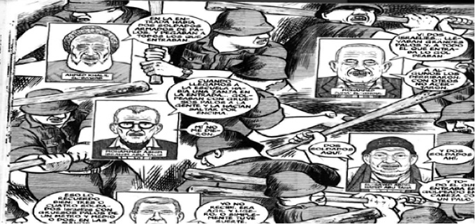 Hay dos formas de repetición. La primera corresponde a la inserción de varias versiones sobre un mismo acontecimiento. Sacco presenta el mismo hecho contado por tres o cuatro testigos con variaciones mínimas, tal es el caso del llamado por parlantes en que se solicita a los varones que se presenten en la escuela (Notas 205). Se podría pensar que la repetición obedece a un celo periodístico de fidelidad y de búsqueda de verdad, sin embargo, su uso se vuelve tan pesado que fascina al lector, es como si el acontecimiento narrado hubiera ocurrido todas esas veces. El caso más emblemático y que se transforma en obsesión es el momento en que los hombres ingresan a la escuela y son golpeados en la cabeza con garrotes por los soldados israelíes. El momento se repite contado por varios sobrevivientes, produce en el lector la sensación de eternización (231-44), además, en un trabajo gráfico magistral, replica la imagen del soldado israelí en distintas posturas golpeando una y otra vez sin clemencia. Una vez más se trata de una página completa, sin bordes y sin viñetas al interior.