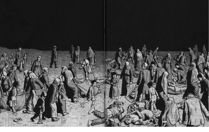 Sacco paulatinamente concede mayor espacio a los testimonios de los sobrevivientes, las anacronías se multiplican hasta la inesperada parte final en que los tiempos se abolirán peligrosamente. Mencioné al principio que de las dos matanzas, Khan Younis y Rafah, Sacco le confiere mayor espacio a la de Rafah. Esto lo explica al comienzo también, ya que la considera un episodio mucho más oscuro y complejo. A partir de la página 120 da por cerrado Khan Younis y se sumerge, luego de una pequeña pausa, en la matanza de Rafah. Notas está divido en tres partes disparejas: la primera titulada “Khan Younis” (de la página 2 a la 119), una segunda muy breve titulada “Festín” (de la 123 a la 150) y la más extensa, “Rafah” (de la 151 hasta el final en la página 386).