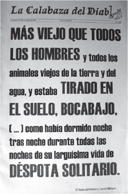 Mientras en Chile, en marzo de 1994, asume como nuevo presidente Eduardo Frei Ruiz-Tagle, en los pastos del Campus Juan Gómez Millas de la Universidad de Chile, dos estudiantes de Literatura, Marcelo Montecinos y Jaime Pinos, comienzan una amistad que con el tiempo impulsaría la creación de una de las revistas más importantes del circuito contracultural de fines de los años noventa y comienzos de los dos mil: La Calabaza del Diablo. Este proyecto vio la luz cuatro años más tarde, cuando en noviembre de 1998 publica una sugerente portada que, casi a página completa reproduce una cita de El otoño del patriarca (1975) de Gabriel García Márquez, que la crítica especializada había inscrito dentro del género de la “novela del dictador”, junto con otros textos como El señor presidente (1946) de Miguel Ángel Asturias, El recurso del método (1974) de Alejo Carpentier, o, Yo, el supremo (1975) de Augusto Roa Bastos.