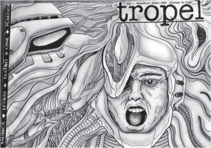 Los antecedentes de La Calabaza del Diablo se remontan a otra revista, Tropel (Imagen 5), aparecida en 1996, en la cual colaboraron los hermanos Marcelo e Isolda Montecinos, Jaime Pinos y Roberto Contreras, quienes son parte del equipo fijo de los 33 números de La Calabaza. En Tropel ya se pueden apreciar ciertos intereses compartidos: textos sobre música, plástica y teatro; crítica de cine y de literatura, y la inclusión de poesía y dibujo. Este antecedente no es menor, porque en esta revista hay elementos discursivos que aparecen en La Calabaza: el interés por incluir dibujo con la creación de la revista gráfica “La Momia Roja”, publicada a partir de abril de 2004 a cargo de Christiano (Carlos Reyes) –de quien se realiza un reportaje y la crítica de un texto de su autoría publicado por la editorial Ergo Cómics–; y el interés en cierta tradición de la poesía chilena con autores como Carlos Pezoa Véliz, Pablo de Rokha, Enrique Lihn, Jorge Teillier, Rodrigo Lira, Nicanor Parra y José Ángel Cuevas.