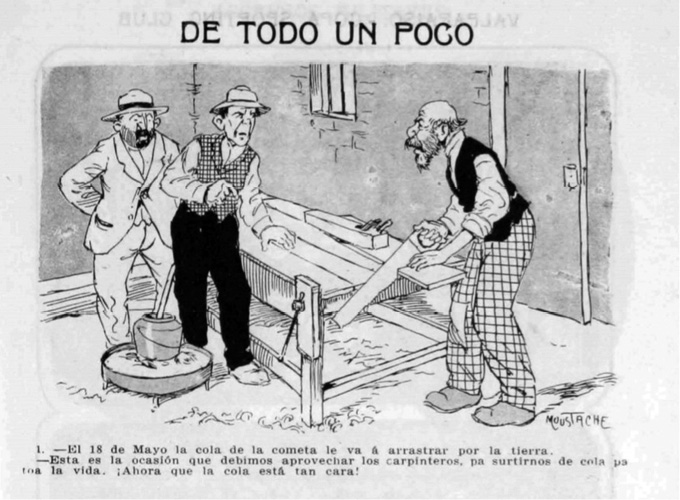 El caricaturista Moustache relacionó el elevado precio del pegamento (la cola) con el paso del cometa Halley (la cola del cometa). La utilización de apenas dos diálogos para explicar la ilustración revela con cuánta firmeza se había instalado la noticia del evento astronómico en el público. Para que los lectores de Zig-Zag pudieran comprender el sentido de esta caricatura, debían estar totalmente enterados de las múltiples versiones que circulaban sobre la supuesta condición tóxica de la cola de los cometas, así como de las teorías de que la cola del Halley podría llegar a interaccionar con nuestro planeta. En efecto, la sociedad nacional e internacional se encontraba recelosa de esta situación desde “el descubrimiento por parte de Daniel Morehouse (1876-1941) en 1908 de un nuevo cometa que, según el análisis espectroscópico realizado del área brillante de su alrededor, portaba diferentes gases, incluyendo algunos altamente tóxicos para las personas, como el cianógeno” (Ruiz-Castell 174). La prensa diaria española, por ejemplo, que era desde donde provenían muchas de las colaboraciones publicadas en proyectos periodísticos chilenos, explotó esta incertidumbre respecto a qué sucedería si la cola del cometa pasaba por la Tierra (Ruiz-Castell 174), así como las revistas de circulación más distanciada porque el tema era de alto interés público, y las empresas editoriales con fines comerciales necesitaban captar suscriptores.