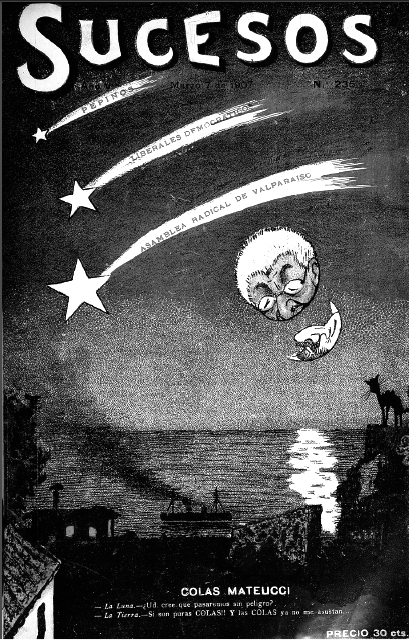 Además de la publicidad farmacológica y de la economía, el saber astronómico también aparece en los magazines en función del contexto político. Esto se puede corroborar con la portada del n.º 235 de la revista Sucesos (1907). En ella se observan tres astros con sus respectivas colas, y en cada una de estas se lee: “Pepinos”, “Liberales democráticos”, “Asamblea radical de Valparaíso”. Debajo de la ilustración se añadió el anuncio: “Colas Mateucci”, junto al diálogo: “–La luna: –¿Ud. cree que pasaremos sin peligro? –La Tierra: –Si son puras COLAS! Y las COLAS ya no me asustan…”.
