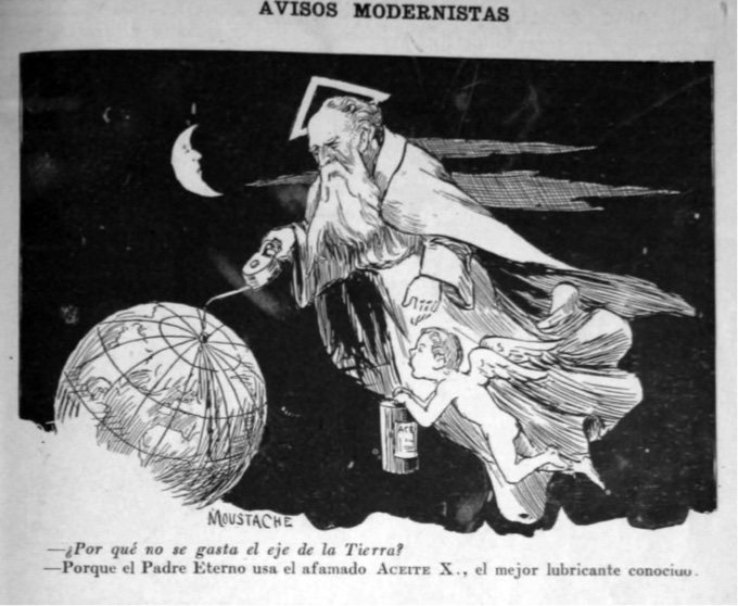 La imagen muestra a un ángel y a dios, quien vierte un líquido sobre el eje de la Tierra. El diálogo versa así: “–¿Por qué no se gasta el eje de la Tierra? –Porque el Padre Eterno usa el afamado Aceite X, el mejor lubricante conocido”. La colaboración del caricaturista Moustache22 resulta curiosa y no del todo descifrable, puesto que, por una parte, la “X” pudo estar haciendo publicidad efectiva a un aceite denominado con dicho nombre23, pero, por otra, la “X” y el título “Avisos modernistas” pueden ser una burla del abuso de temáticas astronómicas por parte de los publicistas24. Si este hubiese sido el verdadero objetivo de la ilustración, el caricaturista estaría dando cuenta de cuán familiar se habría vuelto la astronomía para los lectores de estos magazines y, sobre todo, de cuán establecido se encontraba el uso del saber astronómico para otros fines, como la publicidad.