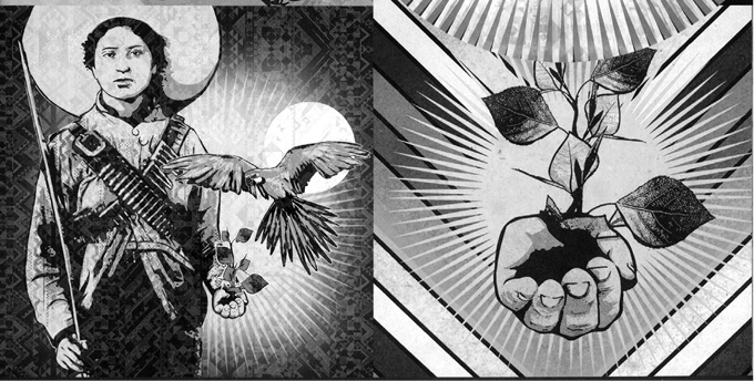 Las representaciones visuales incluidas en el disco, elaboradas por el ilustrador y diseñador Pablo de la Fuente, más conocido como Gráfika Diablo Rojo14, anuncian desde un comienzo el posicionamiento vital e ideológico desde el cual se articula este último proyecto musical. En el caso de la portada (imagen 1), observamos la transformación del cuerpo de Tijoux en un árbol, mientras sus pies y mano derecha tocan la tierra y sus brazos son cubiertos por diseños de textiles indígenas. Situada en el centro y acompañada de dos pájaros rojos con sus alas extendidas, su figura se encuentra rodeada de rayos luminosos que recuerdan la estética de la religiosidad popular latinoamericana y que confieren a esta escena la idea de un alumbramiento o momento epifánico.