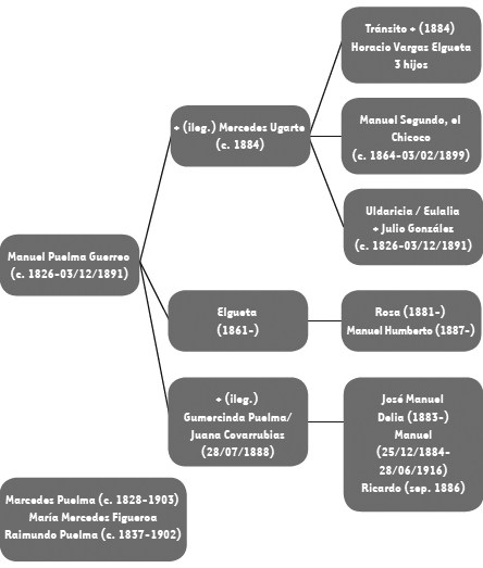 En segundo lugar, se perfila la fragilidad social de estos niños y el desorden de su familia. Los menores en cuestión son hijos ilegítimos de Manuel Puelma Guerrero, que no siendo acaudalado, contaba con unos ciertos medios económicos, y de una mujer cuyo origen no logra quedar del todo esclarecido en el expediente. Manuel Puelma Guerrero tuvo hijos con tres mujeres. Con Juana Ugarte tuvo tres hijos ilegítimos: Manuel, El Chicoco, Tránsito y Euldarisa Puelma Ugarte. En 1889 se casó con su sobrina, Rosa Puelma Elgueta, con la cual tuvo dos hijos legítimos, Rosa y Manuel Humberto Puelma Puelma. Finalmente, con Gumercinda Puelma Covarrubias –el expediente la nombra también como Juana Covarrubias– tuvo a sus cuatro hijos menores, Manuel, Delia, José Manuel y Ricardo Puelma Puelma, ilegítimos y sobre los que recaía la sospecha de ser incestuosos (testimonios de Horacio Vargas, f. 19, y de María Mercedes Figueroa, fs. 67)6.