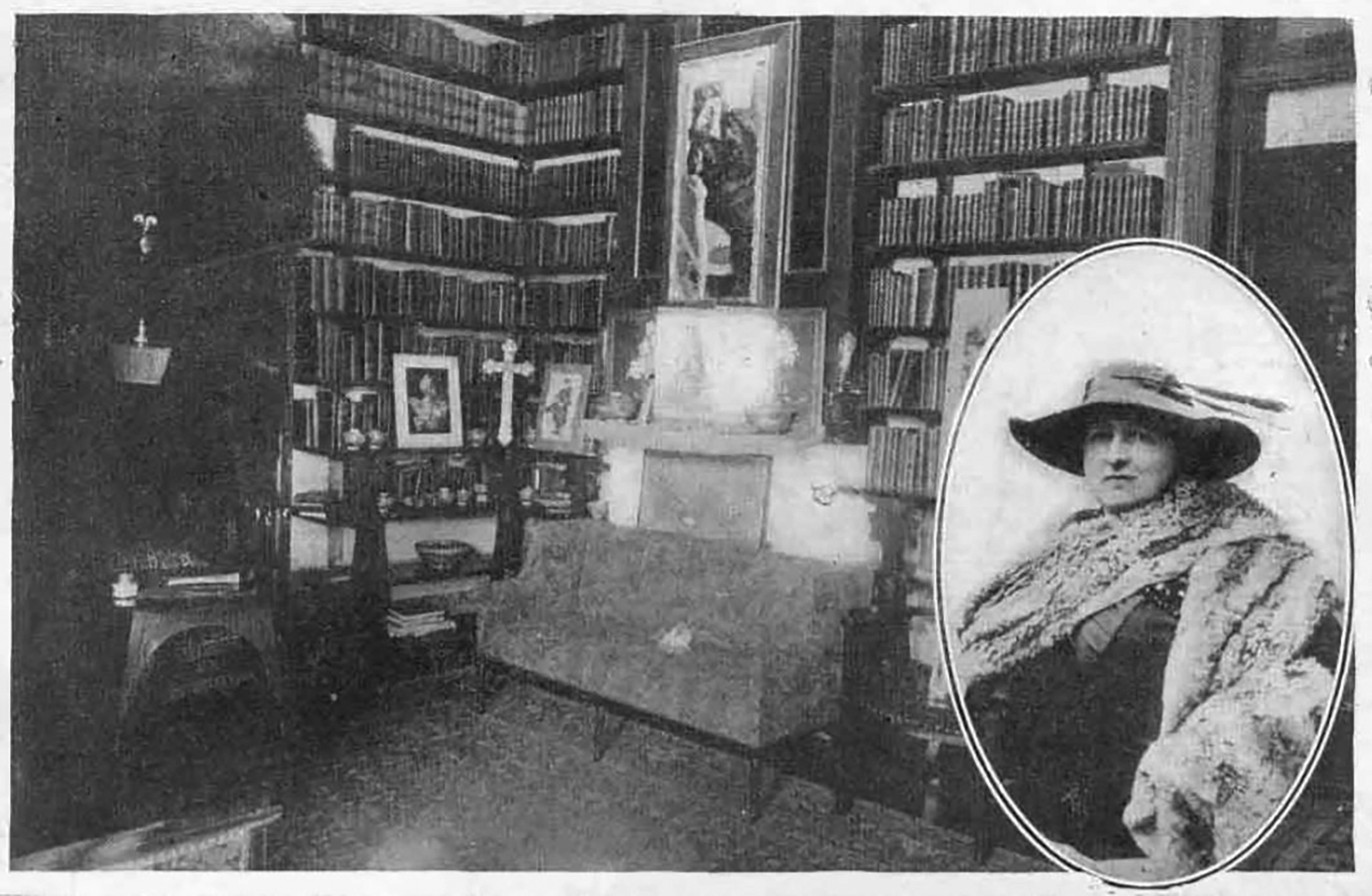 En una fotografía de 1915 se expone la biblioteca de Luisa Lynch: entre los libros, en el aparador, en la esquina, al lado del sillón, entre cerámicas, cruces y retratos, yacen situados ukiyo-e (estampas). Su punto de vista no es frontal; se hallan encajados como un volumen que sobresale –y empuja– las paredes. La mirada que exigen es la del cuerpo sentado, reclinado, en atención a la lectura o al diálogo, cuyo punto de fijación es desde la perspectiva de las sillas y sillones (fig. 2).
