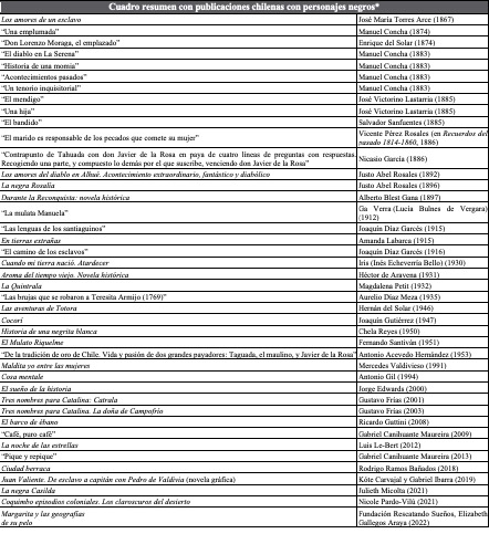 Es fundamental consignar que la historia de la literatura chilena ofrece una cantidad importante de obras que testimonian la presencia negra en nuestro país. Desde personajes centrales de una trama narrativa hasta figuraciones secundarias o simples decorados dentro de la escena literaria, estas representaciones remiten a un entramado textual que imagina la nación, la moldea y prefigura según el proyecto moderno. (“Cuerpos, emociones” 71)