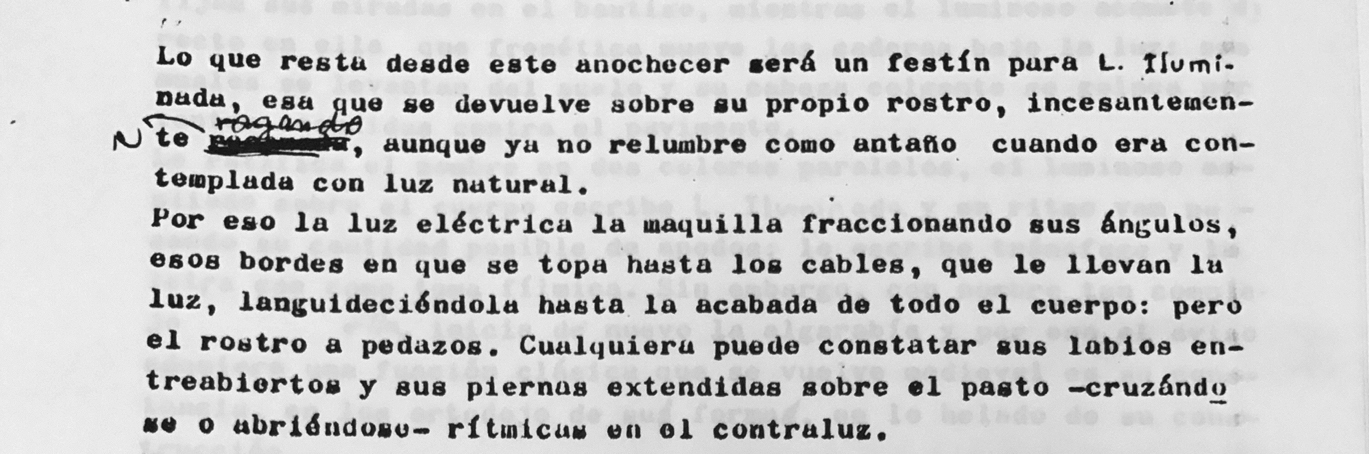 Justamente, el complejo dispositivo que erige Lumpérica, su electricidad, solicita entender cómo ambas figuras visuales, el cartel lumínico y la cámara, son capaces de alterar el cuerpo de L. Iluminada: “El luminoso no se detiene. Sigue tirando la suma de nombres que los va a confirmar como existencia” (7-8). De esta manera, la novela da cuenta sistemáticamente de la capacidad seductora del Luminoso, la fuerza orgásmica, en el sentido que le adjudica Paul Preciado, que imprime y requiere la mirada totalitaria inscrita en el ojo mecánico de Dios. Entonces, el dispositivo cinematográfico que se basa en el corte es también capaz de perpetrar sus cortes en el cuerpo de L. Iluminada.
