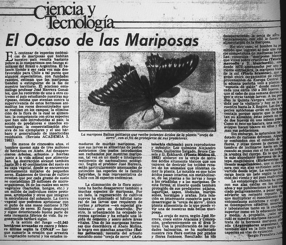 Prenafeta Jenkin, Sergio. “El ocaso de las mariposas”. El Mercurio, Ciencia y Tecnología, 6 de marzo de 1983, D-10.