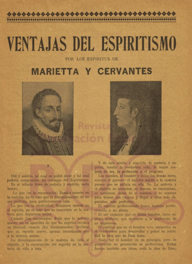 Se encuentran una diversidad de ejemplos adicionales en la cultura impresa espiritista de comienzos del XX. Así, la autoría Miguel de Cervantes sumaría a sus producciones literarias una coautoría con el espíritu Marietta en el panfleto “Ventajas del espiritismo” (1900), presuntamente transmitida al médium Daniel Suárez Artazu. Asimismo, en 1930, Santa Teresa de Jesús se actualizaba performativamente a favor de la misión espiritista en el libro La filosofía según los tiempos, dictado a la médium Elvira Vilches. En sus páginas, la santa informaría de la quema de sus escritos por la Inquisición en el siglo XVI, atestiguando que La filosofía según los tiempos habría sido uno de ellos. La función-autor de Teresa de Jesús legitimaba así a Elvira Vilches para efectuar una entrada textual en la esfera pública en la que, además de ejercer una dura crítica a la Iglesia y el clero, predecía un crudo y ardiente Apocalipsis y enunciaba reclamos políticos librepensadores como la aceptación de la revolución social o la redistribución del trabajo y su justa remuneración (251).