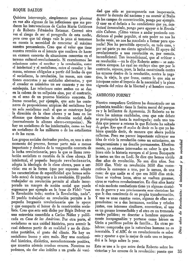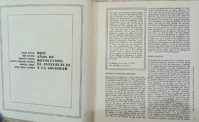 El escenario que acabo de delinear puede leerse como un instante de transición, en el que un sector de la intelectualidad cubana –el de los revolucionarios heterodoxos, caracterizados por su flexibilidad ideológica, su vocación latinoamericanista y su interés por respaldar la apuesta estratégica de autonomía revolucionaria vis-à-vis con el modelo soviético– pierde la hegemonía sobre el campo cultural y debe negociar (primero), acomodarse (después) y replegarse (en último término) ante el avance de posiciones ortodoxas en la isla. De tal suerte, la mesa redonda que da origen a “Diez años de revolución. El intelectual y la sociedad” se instala en pleno desarrollo de esta tensión entre franjas intelectuales, funcionando como una intervención política merced al ejercicio de lo impreso. Como se señala en un apartado al inicio del texto, se trató de una instancia conversación y de intercambio de