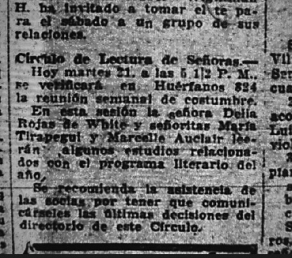 Hoy martes 21 a las 5 ½ P.M. se verificará en Huérfanos 824 la reunión semanal de costumbre. En esta sesión la señora Delia Rojas de White y señoritas María Tirapegui y Marcelle Auclair leerán algunos estudios relacionados con el programa literario del año. (10)
