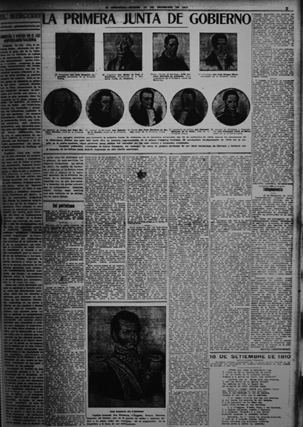 En la medida que la retórica afectiva se intensifica, también los discursos transgredidos son reposicionados en su lugar de poder; así, la nación y el género vuelven a alinearse: “la patria no la podréis abolir jamás porque la patria está en vosotras y es la carne de vuestra carne y el alma de vuestra alma” (3). El impacto de esta conferencia-contestación al parecer fue significativo, pues el 18 de septiembre es publicada a página completa en El Mercurio. Una mirada a los paratextos arroja luces en esa dirección: el texto está acompañado de una galería de imágenes de egregios patriotas que participaron en la Primera Junta Nacional de Gobierno de 1810, junto al retrato de otros próceres como O’Higgins.