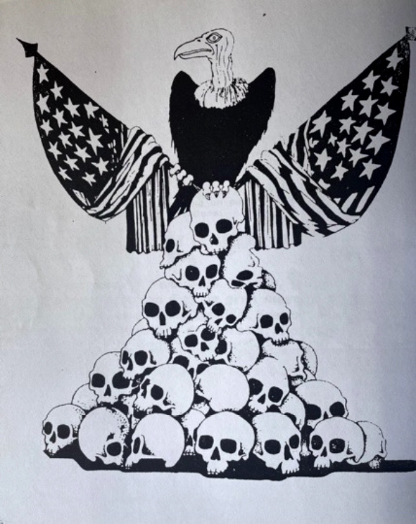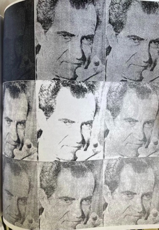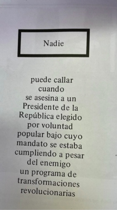 Hacia el final del volumen, en la página derecha negra y texto calado en blanco, Marín se refiere al mito de la democracia chilena, relato nacido con el mismo golpe militar del 11 de septiembre de 1973. Su argumentación pasa inexorablemente por la experiencia personal y colectiva de reconocimiento de la miseria, el despojo y el miedo, a la vez que el horror del asesinato de Salvador Allende: “la doble conducta de la clase dominante que habiendo sacralizado un sistema de convivencia, de acuerdo a sus intereses políticos y económicos, no vacilaba ahora en demoler sus principios para imponer otros que les sirvieran mejor”(s. p.). Se trata de infligir la carga a Chile, que cual Sísifo arrastra esa condena sin otras posibilidades. Este recurso textual se encuentra materialmente rodeado y asechado: en la página izquierda, frente al texto, encontramos una ruma de calaveras que en su punta despliegan dos bandera de EE.UU. y entre ellas un buitre, en la página derecha anterior una versión a la usanza del pop art de Warhol, con la imagen de Richard Nixon repetida en los nueve cuadrantes del plano24, por último, en la página izquierda siguiente al escrito encontramos una fotografía al corte del rostro del presidente Allende (imagen 7). Como podemos notar el montaje y la curaduría de los archivos es absolutamente relevante en este proyecto interartístico de Marín y Cardoso.
