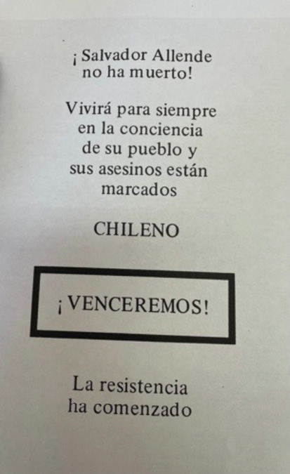Estas manifestaciones iracundas, vinculantes con la consigna (Chile o muerte) se distribuyen rizomáticamente, sobre todo en el último tercio del manuscrito, donde se exhiben los materiales o archivos propios del primer año de dictadura, por cierto, horrendamente generalizable a los 16 años restantes del gobierno de Pinochet. El espanto popular por la muerte del presidente Salvador Allende (imagen 4) se deja ver en las imágenes que grafican este impactante magnicidio que incluso fue intuido o presagiado en el discurso pronunciado por el presidente en la Asamblea General de las Naciones Unidas, el 4 de diciembre de 1972, cuando con voz fuerte y clara apunta: