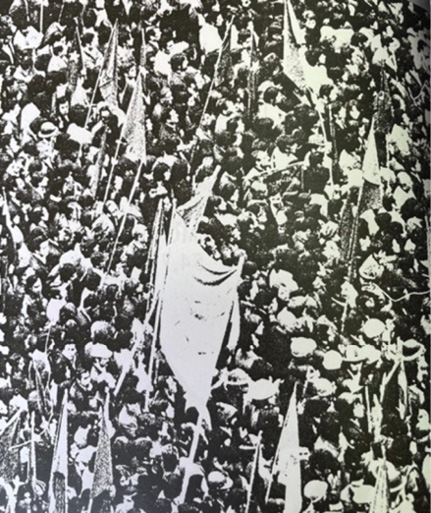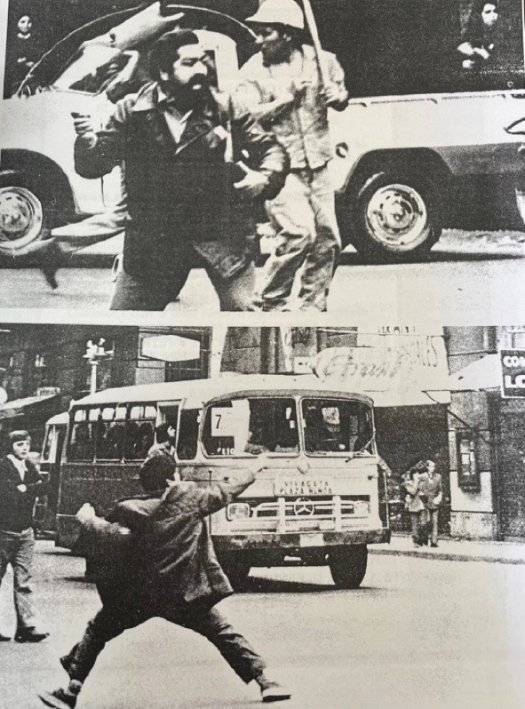 La ira evidenciada tanto en fotografías de Cardoso, como en campañas publicitarias y panfletos seleccionados y montados en el flujo interartístico, dejan entrever una singular defensa de la patria que nace desde la concepción misma del volumen y su título. Las multitudes, las pancartas, los recortes de prensa son armas de restitución (imagen 3), previas al alzamiento concreto de las armas por el Frente Patriótico Manuel Rodríguez20, por ejemplo; quienes desde la clandestinidad planificaron el derrocamiento del régimen liderado por el dictador Augusto Pinochet.