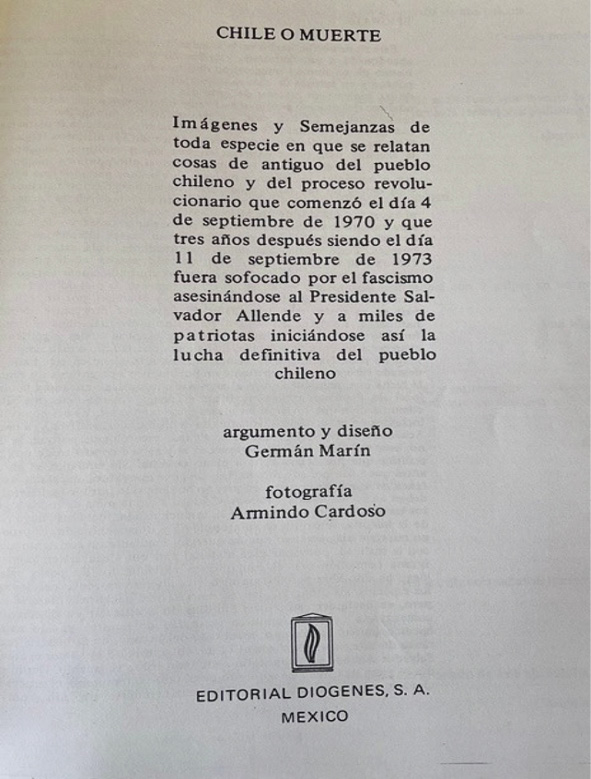 El volumen iconotextual construido9 por Marín y Cardoso, es un fotolibro10 cuya edición rústica fue publicada en México en 1974 por la editorial Diógenes, es un volumen sin paginar de 22 x 19 cm que en su interior concentra una gran cantidad de textos poéticos (sin información de autor para proteger su integridad, al igual que en la obras plásticas incorporadas), publicidades, recortes de diarios, obras plásticas, viñetas de comics, fotografías: del mundo social chileno, de manifestaciones, de violencia en las calles; instructivos para resistir y desmantelar la estructura de poder dominante, que a pesar de su molaridad no pudo acallar ni aplastar la reserva utópica colectiva que ha recobrado vitalidad en Chile durante los últimos años. Se divide al menos en dos partes: la primera, se refiere al contexto de la Unidad Popular (UP), su proyecto revolucionario en desarrollo, aunque en peligro; y el segundo, al golpe militar y las vejaciones producidas en su instalación por la fuerza.