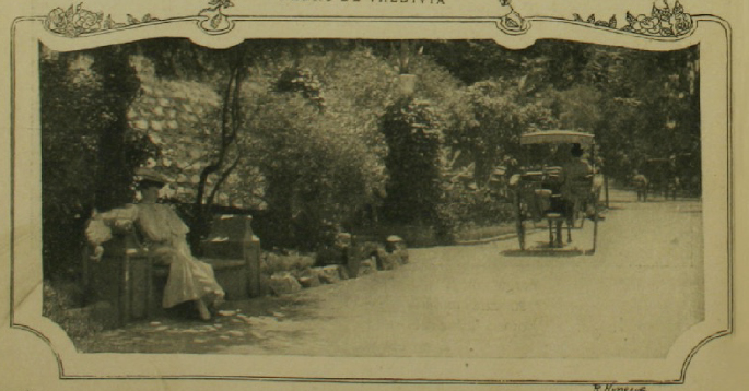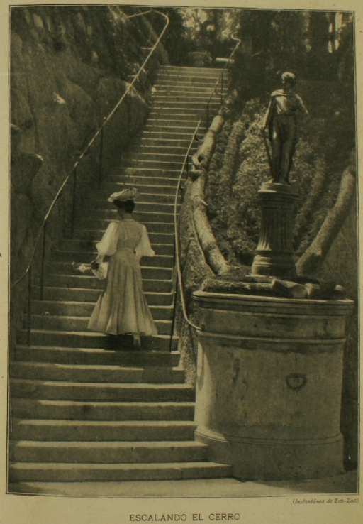 Ahora bien, si los comentarios de Lemay y Boyd exaltaban las bondades y bellezas del cerro Santa Lucía, para 1905 las cosas parecen haber cambiado. El cerro había dejado de ser la promesa de una ciudad moderna y se volvía un tranquilo lugar del pasado y la nostalgia, tal como anota un artículo de la revista Zig-Zag: “si realmente se amara el Santa Lucia, no se verían tan despobladas sus avenidas, tan silenciosas sus plazuelas, tan desiertas sus bancas” (10). El autor lamenta que todos habían ido al cerro “alguna vez; pocos, muchas veces” (8). Por eso, el texto funciona como una invitación o propaganda para volver a situarlo como “el mejor sitio de paseo, de distracción y de solaz” (8), dando cuenta de su ubicación privilegiada “en el medio de la ciudad, cerca de los colejios, de las oficinas, de las casas, de los clubs” (10). Además, alaba al cerro como sitio de recreo, salud y ejercicio (11), acorde con las nuevas ideas higienistas de fines del siglo XIX y principios del XX (Leyton y Huertas). El artículo funciona a la manera de un fotorreportaje pues viene acompañado por cinco fotografías que siguen a una mujer solitaria, una “hermosa paseante, vestida con elegantísimo traje de mañana”, desde que llega al cerro en su carruaje, sube sola por las escalinatas y se sienta en lugares de descanso.