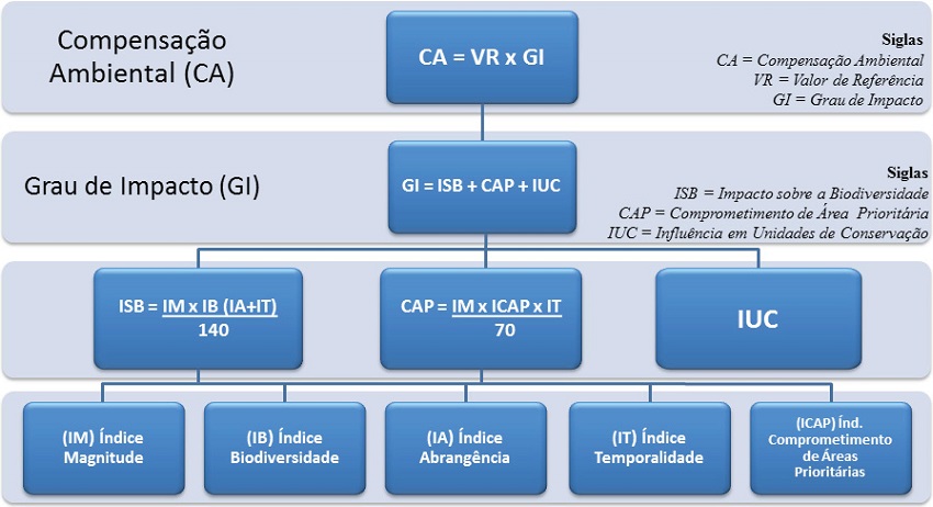 Este último Decreto instituído inovou ao definir em seu Anexo a Metodologia de Cálculo do Grau de Impacto Ambiental, que é utilizada atualmente para definir o grau de impacto (GI) de um empreendimento e, consequentemente, qual o valor da compensação ambiental a ser despendido pelo empreendedor tendo como base o valor de referência (VR). O VR é o somatório dos investimentos necessários para implantação do empreendimento, não incluídos os investimentos referentes aos planos, projetos e programas exigidos no procedimento de licenciamento ambiental para mitigação de impactos causados pelo empreendimento, bem como os encargos e custos incidentes sobre o financiamento do empreendimento, inclusive os relativos às garantias, e os custos com apólices e prêmios de seguros pessoais e reais.