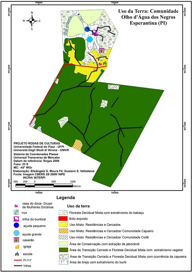 Para a compreensão da organização espacial e do padrão de uso das terras, utilizam-se oficinas de mapeamento participativo e as técnicas de sensoriamento remoto. Inicialmente, foram identificados, por membros da comunidade, os pontos-limite, a partir de estacas por eles fincadas e chamadas, localmente, de variantes, que foram posteriormente conferidos com os dados do INCRA/INTERPI e trabalhos de campo.