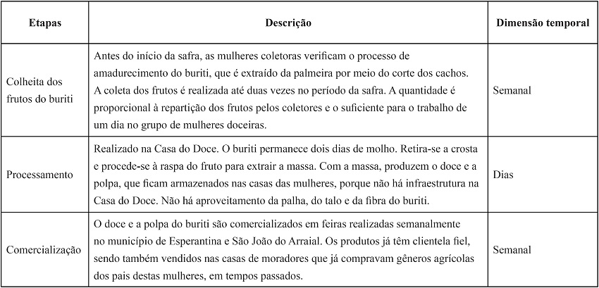 Em oficinas realizadas durante o Projeto Roda de Cultura, estas mulheres discutiram as suas expectativas e as práticas produtivas, revelando o desejo de conhecer mais sobre o aproveitamento dos produtos do extrativismo em outros elos de produção, como o artesanato. Segundo elas, a Casa do Doce foi construída em razão do desperdício de frutas da estação, mas sentem a necessidade de melhorar e aumentar a produção, que carece de mais infraestrutura, aperfeiçoamento do trabalho e melhores condições de escoamento para o mercado regional. A Figura 3 sintetiza as etapas da cadeia do buriti na comunidade Olho d’Água dos Negros: