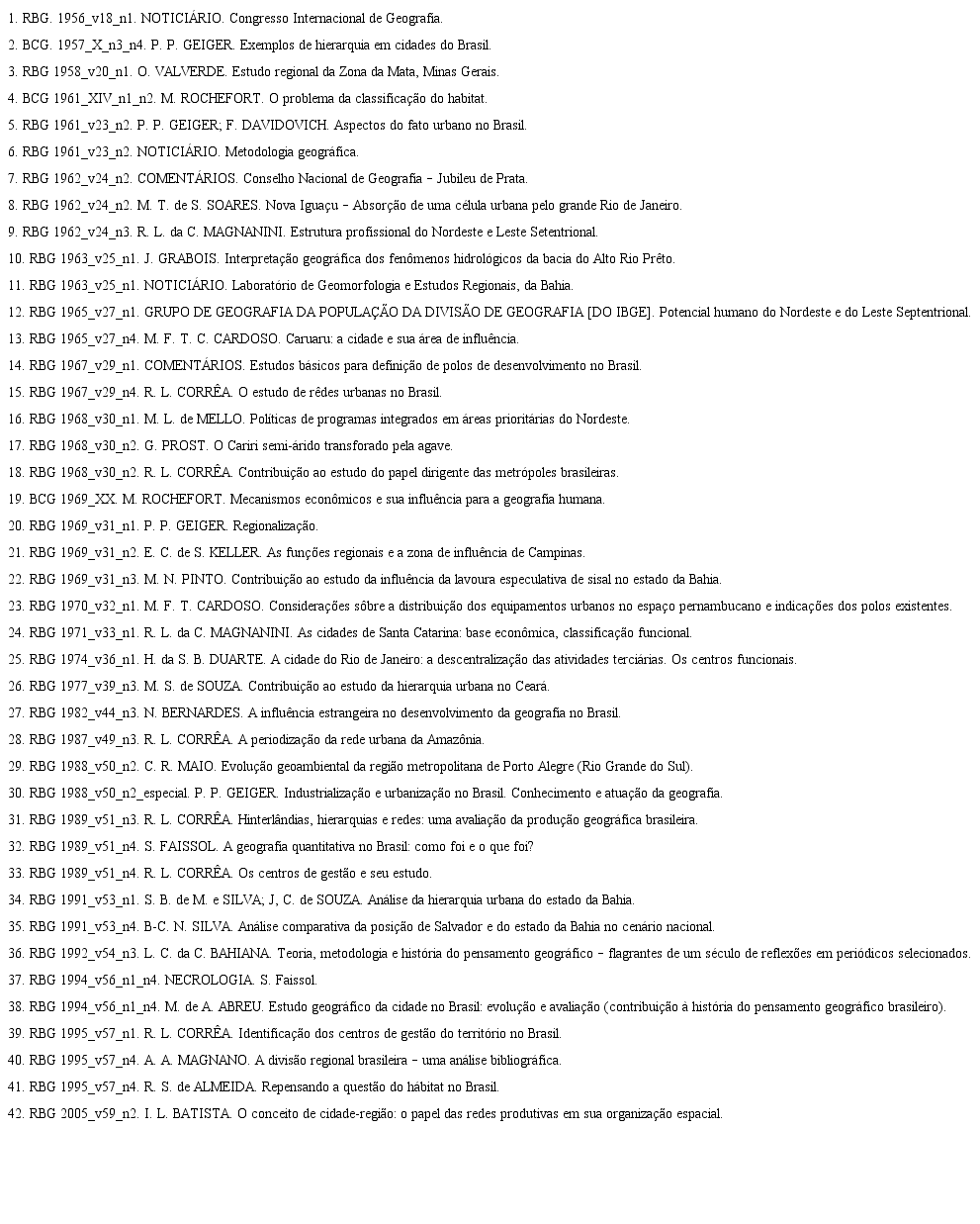 GEIGER, P. P. Exemplos de hierarquia em cidades do Brasil. In: Boletim Carioca de Geografia. Rio de Janeiro: Associação dos Geógrafos Brasileiros, Seção Rio de Janeiro, 1957, Ano X, n. 3 e 4, pp.5-15.