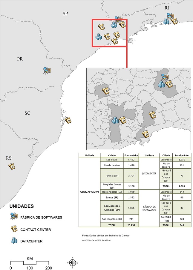 Como apresentado na Figura 2, a empresa mantém sua sede em Mogi das Cruzes (SP); os datacenters em São Paulo (SP), São José dos Campos (SP) e Rio de Janeiro (RJ); as fábricas de softwares nas três cidades anteriores e Curitiba (PR); e as operações de teleatendimento em outras oito cidades. No total, a empresa possuía, em 2011, pouco mais de 23 mil funcionários nas centrais de teleatendimento (Contact Centers), quase dois mil nos datacenters e em torno de 600 nas fábricas de softwares.