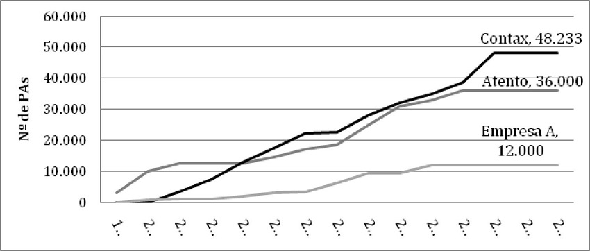 A Figura 3 apresenta a evolução no número de PAs das empresas Atento, Contax e Empresa A entre 1999 e 2013, e demonstra como as duas primeiras, em períodos distintos, expandiram suas estruturas produtivas.