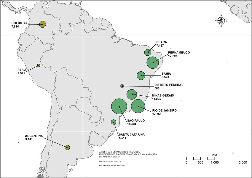 Diferente da Atento, que privilegiou a instalação de unidades nas grandes metrópoles do Sudeste, a empresa Contax tem instalado suas novas centrais de atendimento, sobretudo, na região Nordeste e em outros países sul-americanos. A figura a seguir apresenta a divisão territorial do trabalho da empresa.