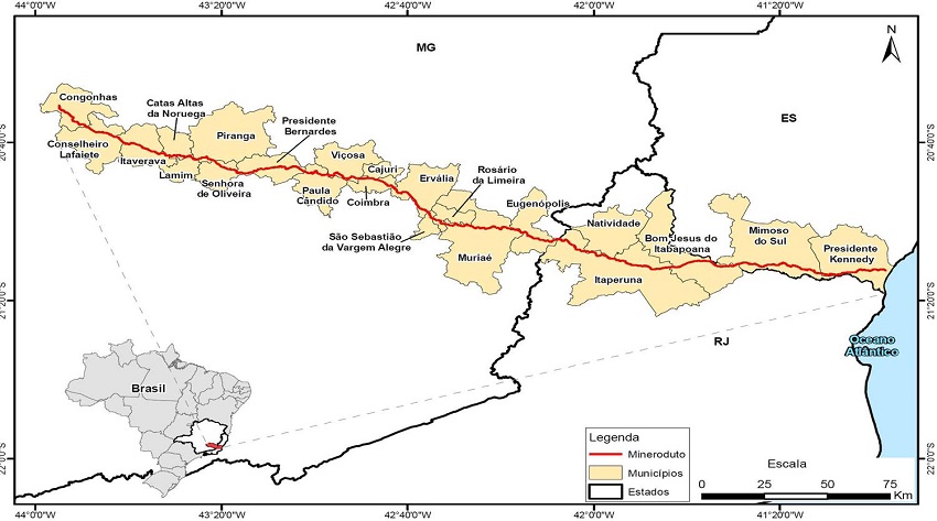 A empresa Ferrous Ressources S/A, de capital norte-americano, australiano e inglês, está buscando implantar um Projeto de Mineroduto, com uma faixa de servidão de 100 metros de largura e 400 mil metros de comprimento, que ligará o complexo da Mina da Viga, em Congonhas-MG, ao porto da Ferrous Ressources, em Presidente Kennedy-ES. Este empreendimento percorrerá 22 municípios, sendo dezessete em Minas Gerais, três no Rio de Janeiro e dois no Espírito Santo, como pode ser visto na Figura 1.